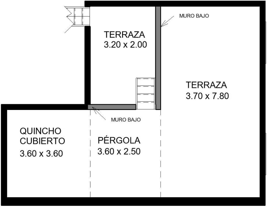 La terraza cuenta con un quincho cubierto. Equipado con parrilla y una mesada, más una pérgola que completa el espacio.